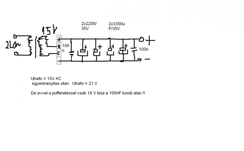Hova lett az a 3V ? Hasznaltam 2x100nF+2x2200uF+2x3300µF - parhuzamosan kotve es egy 25A Greatz Hidat !Semi valtozast nem erzekeltem az erositon a pufferreles utan .. ugyanugy sisteregnek a hangszorok ![]() Koszonom elore valaszotokat .