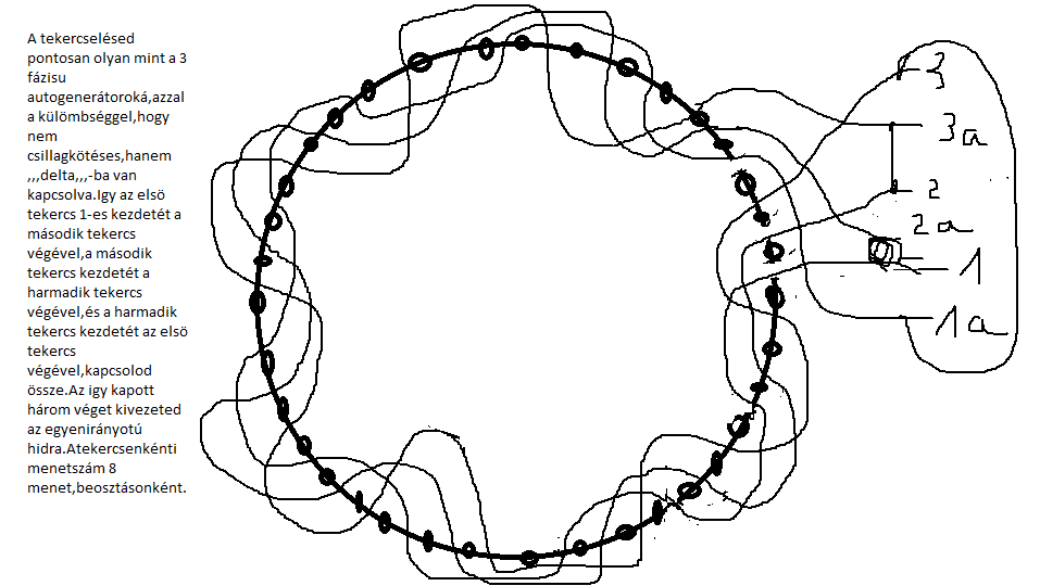 Az összes tekercs a delta kapcsolás analógiájára körbe van kötve és minden kötéspontról 2-2 dióda jön ki. 1-1 tekercs 1 mágnes szélességet fog át. A te esetedben 4 vagy 5 hornyot. Valószínűleg inkább négyet. Eszerint kellene az eredeti menetszám duplájával megtekerni és összekötözgetni. Korábban írták, hogy a fifikás kis kínai 4 szállal párhuzamosan tekert minden egyes tekercset, a menetszám számolásánál arra is oda kell figyelni!
