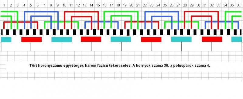 A séma: Első fázis tekercse az 1. horonyba, a horonylépés 5, és be a 6. horonyba. Második fázis tekercse a 7. horonyba, a horonylépés 5, és be a 12. horonyba. Harmadik fázis tekercse a 13. horonyba, a horonylépés 5, és be a 18. horonyba. Első fázis tekercse a 19. hornyba, a horonylépés 5, és be a 24. horonyba. Második fázis tekercse a 25. hornyba, a horonylépés 5, és be a 30. horonyba. Harmadik fázis tekercse a 31. hornyba, a horonylépés 5, és be a 36. horonyba. Ezzel be van rakva 6 tekercs, minden fázishoz kettő.