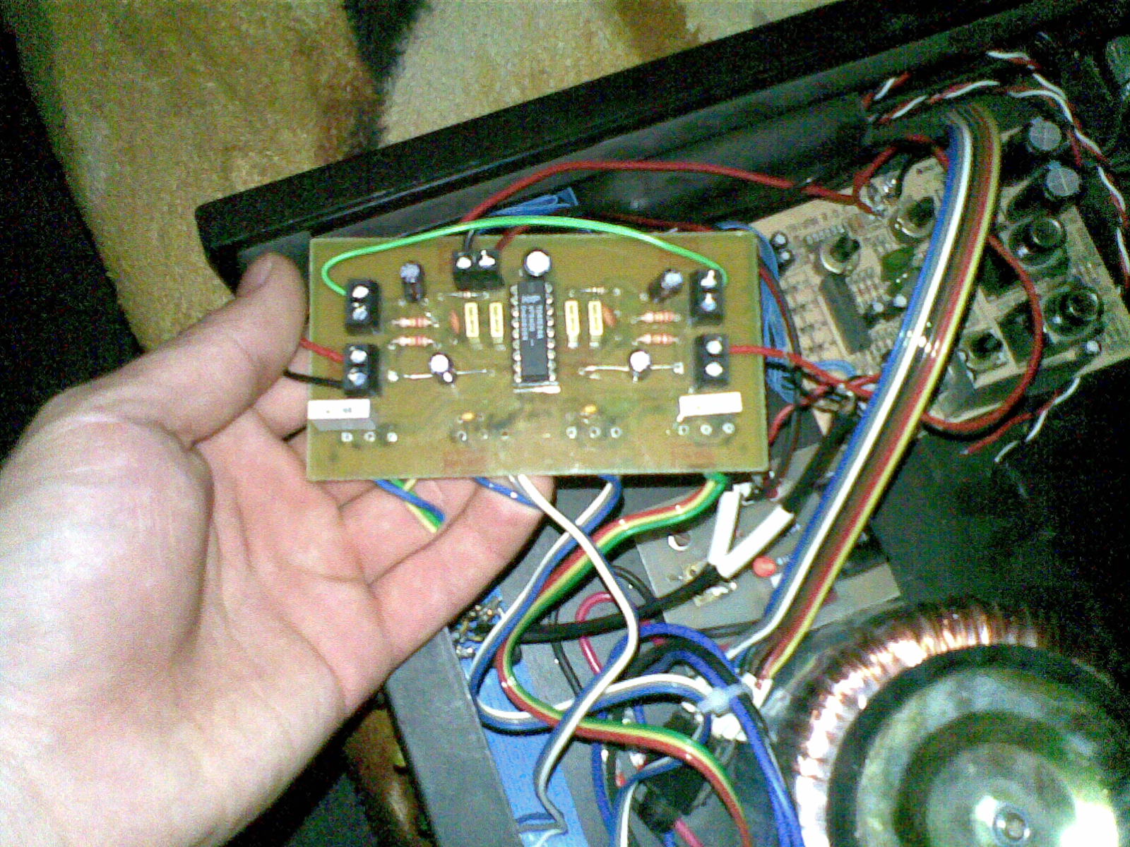 Ebből a bekötésből nem sokat tudok megállapítani, de ha rajzod van hozzá, küld el. A hangszórót ne kösd rá, addig még nem áll be a kimenet 0 voltra, mert tönkre mennek.. Mit javítottál a panelen? A tranzisztorok szerintem már nem jók.ebből a panelrajzból az sem derül ki milyen tranyók vannak benne