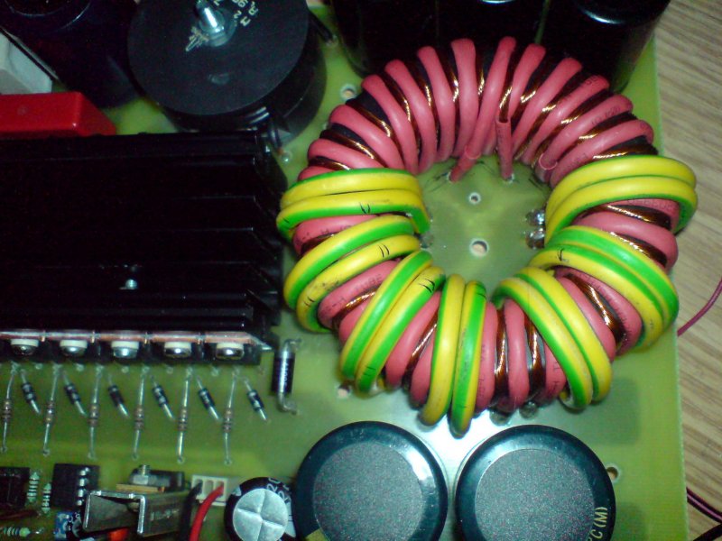 Összeraktam teljesen, de az első próba sikertelen volt, mert túl alacsony a primer tekercs induktivitása (2X) ~3,2menet zárt toroidmagon, 2uH 70KHz. Egyenlőre a tápom ment tönkre, nem ez.