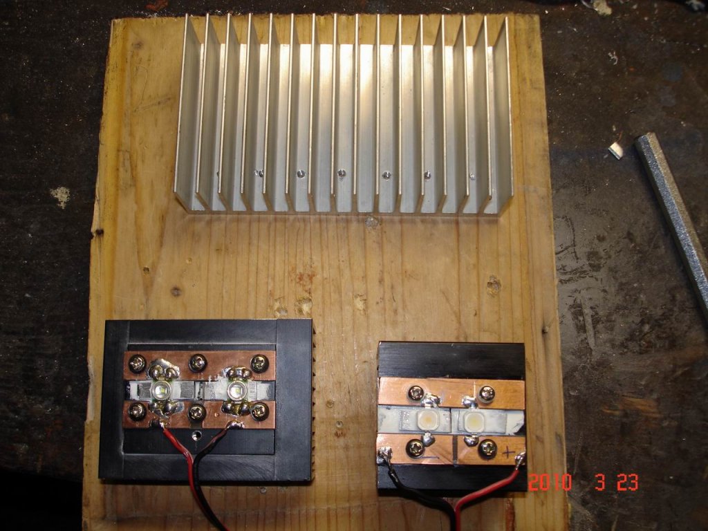 Ahogy ígértem, felteszek pár képet az egyenlőre tesztüzemben működő LED-es világításom egy részéről. Az első képen az van, hogy mekkora bordán voltak először a ledek, aztán pedig, hogy most mekkorán vannak. Így ezen a bordán 30-40°C körülire melegszik. Aztán kép arról hogyan világít.
