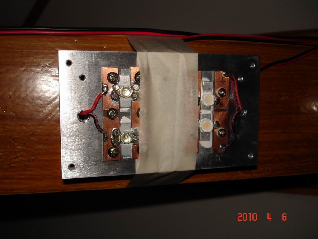 Ahogy ígértem, felteszek pár képet az egyenlőre tesztüzemben működő LED-es világításom egy részéről. Az első képen az van, hogy mekkora bordán voltak először a ledek, aztán pedig, hogy most mekkorán vannak. Így ezen a bordán 30-40°C körülire melegszik. Aztán kép arról hogyan világít.