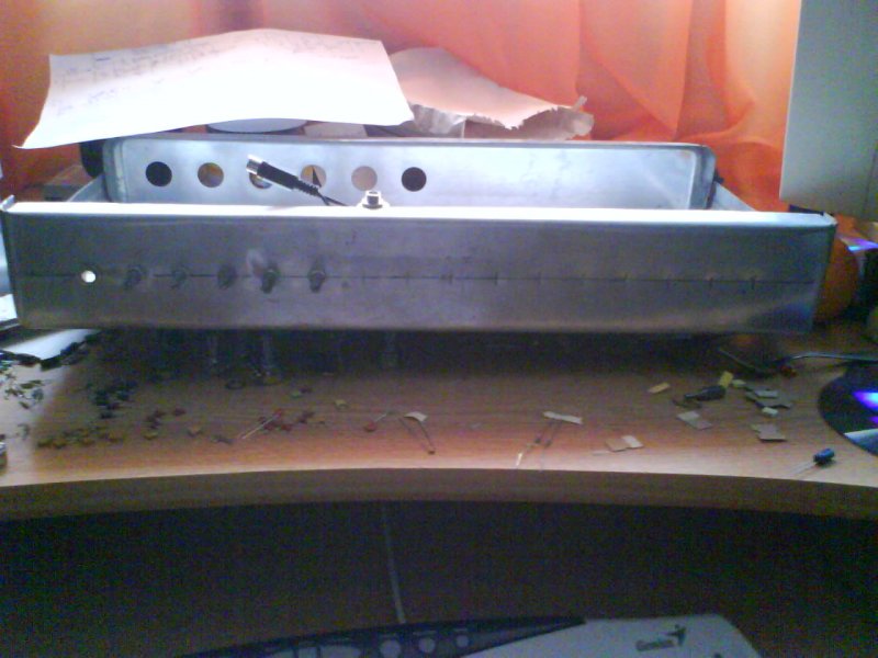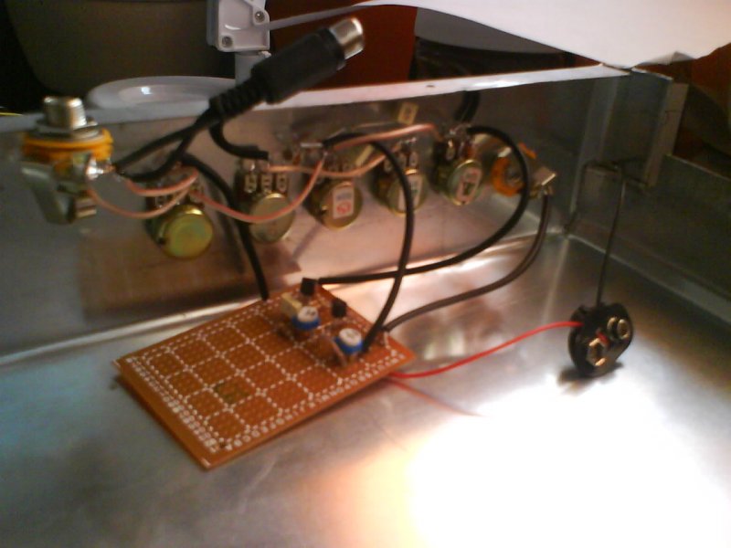 Adaptert már nem tudtam venni, mert eladták az összeset, egy régebben használt ugyancsak +/-15V os 2 Zeneres stabilizátort használtam, de ebben az egyik Zener meghalt, így 15V ra stabilizált, ezt használtam hozzá, lehet ettől van a búgás, meg lehet az, hogy levegőben "lógnak" a potik, mert úgy forrasztgattam őket össze sima vezetékkel...