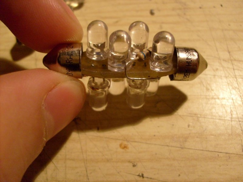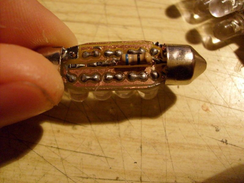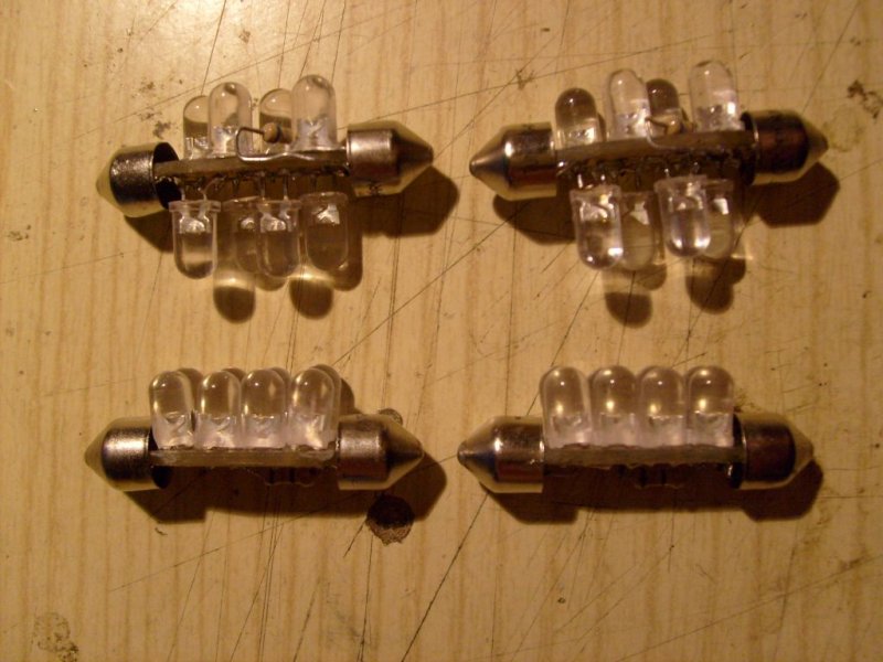 Nem mutattam meg semmit már egy ideje,megmondom őszintén,nem volt időm rá. Nemrég elkészültem egy ledes projektemmel,2 db szélességjelző illetve 2 db rendszámvilágító ún. Szofita izzó lett kiváltva ezekkel. 8 db fehér 5mm-es led sorbakötve...sajnos elszámoltam magam így az smd ellenállások mellé egy egy furatszereltet is oda kellett rögzíteni. Üdv Kicsa