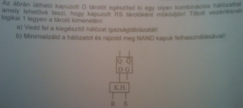 Sürgősen segítség kellene két versenyfeladatban, mert én hosszas töprengés után is csak arra jutottam, hogy rossz a feladat... Például az elsőnél(második) feltételezzük, hogy a gate-et engedélyezzük. Mit köttessek a D flip-flop D bemenetére, ha az R és S -re is 0 jön. Ekkor az előző állapot kell hogy kerüljön Q kimenetre. Ez D tárolónál csak a gatejének tiltásával lehetséges. Szóval értitek... Én szerintem akkor lehet megcsinálni ha az a kombinációs hálózat nem kombinációs hanem sorrendi, méghozzá egy sima RS tároló talán... Hasonló a problémám a másik feladatnál is. Ha valaki érti kérem magyarázza el nekem. Köszönöm. üdv.