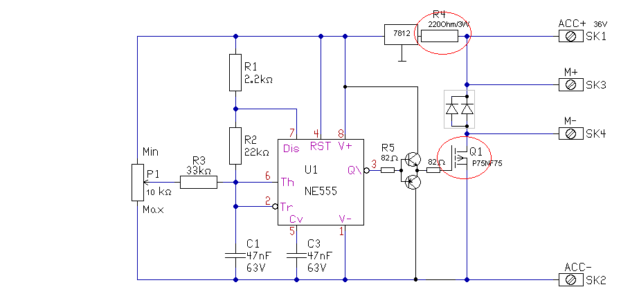Az alábbi két képen az eredeti és az áttervezett kapcsolás látható. Megépítettem az áttervezettet. Ez 36V-os motort hajtana meg(bicajhoz).Az eredeti szabályzó beázott , helyette lenne ez az 555-tel. A 7812 elötti ellenállás nagyon melegszik, és a FET 1-2 mp alatt érinthetetlen lesz. Persze 2db FET kell majd, csak így próbáltam.De szerintem nem kellene ennyire melegednie. Hűtést nem tettem még rá. Freki nem lehet gond, mintha kevés lenne. Egyébként működik az egész, de csak 1percig járattam a melegedések miatt.A FET, a kettős dióda, meg a tranyók az eredeti szabályzóból valók, gondolom hogy akkor elbírják a terhelést. hegusp
