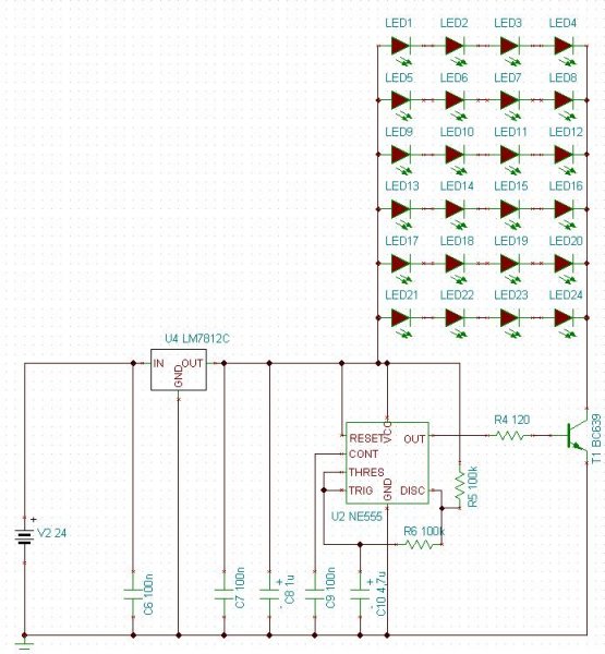 Én nem kötnék ennyi LED-et sorba, rajzolgattam egy kapcsot, nézd meg, én így próbálnám meg. A Tinában nem volt 5mm-es fehér LED, szóval pirosat láthatsz benne, ezt most ne vedd figyelembe! Az LM7812-es IC-nek el kell bírnia 24Vot, bár már nem fog megártani, ha teszel neki hűtést. Tranzisztornak BC639-et tennék. A kitöltési tényezőt (azaz, hogy meddig fog kialudni/világítani a LED, itt tudod állítani. Nem tudom, hogy mihez kell neked...) A kapcsolásomban szereplő R5 az a linken szereplő R2, az R6 pedig az R1. A kondit ne nagyon növeld meg, jó az úgy, minél kisebb, annál pontosabb lesz az időzítőd. (A progival "saccold" be az ellenállásaid értékét, és inkább talán trimmert tegyél bele.) A LEDeket leszámítva "párszázas ajánlat". Üdv! (Remélem tudtam segíteni és, hogy minden jó. Várd meg az okosabbakat!)