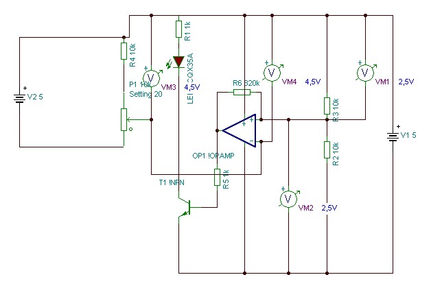 A vm1 (3-as láb)ugye a referencia feszültség amihez viszonyítja a vm4 feszültséget(2-es láb).Amennyiben meghaladja a vm1-et a vm4 akkor a kapu billen és az 1-es láb nyitja a tranzisztort és a led kigyulad.