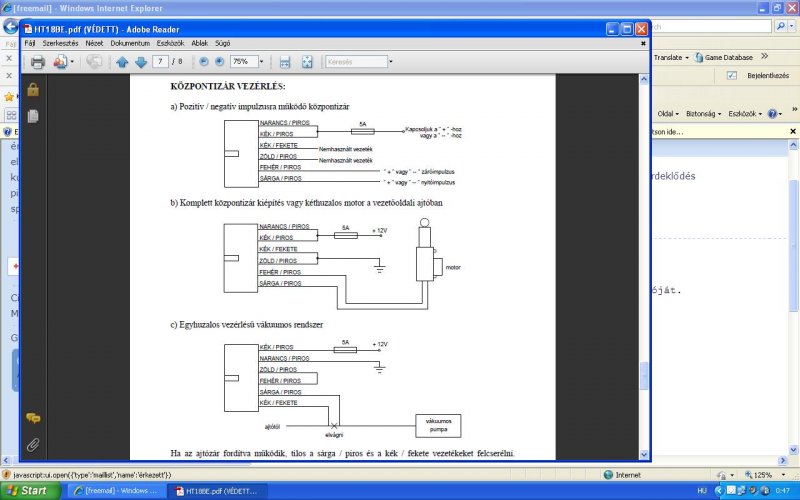 A nyito és záro szálakat a bal elsö ajto vezetékeite célszerü rákötni. Egy probalámpa csipeszét testre teszed, a hegyével végignyomkodod a BE ajto gumiátvezetöjében a vezetékeket. Egyikre nyitni, egy másikra csukni fog. Ezekre kell kötnöd, persze nem fontos azon a helyen, belül, ha a küszöbboritást lebontod, megtalálod azokat a vezetékeket. Szinekre nem emlékszem. Ugyanott megtalálsz az Opelnál szinte mindent, ami a riasztonak kell (indexek, gyujtás+, ajtokapcsolo, tápszivattyu vezetéke az inditástiltáshoz) Most látom, van rajzod a szinekkel, igy még könnyebb lesz.
