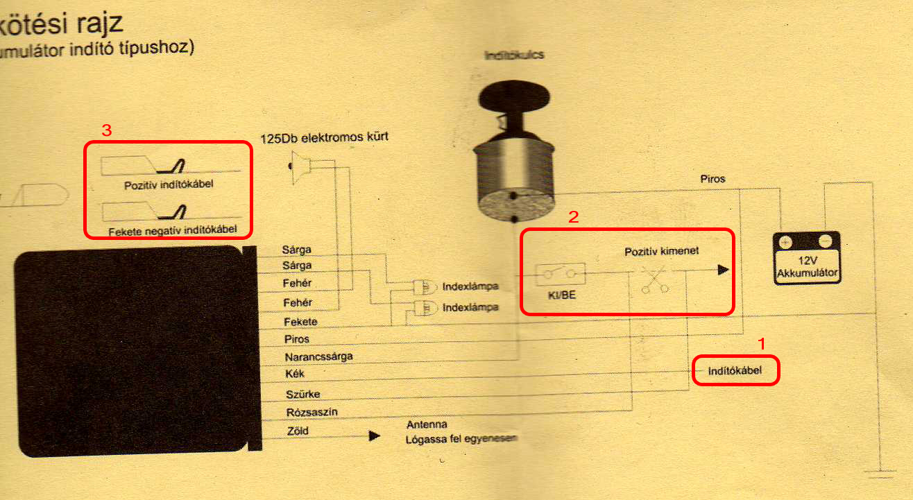 1.:Indítómotor, vagy inkább a reléje a távindításhoz. 2.:Gyujtás megszakítása a rablásgátláshoz (átvágni a gyújtáshoz menő vezetéket, a riasztón keresztül kap áramot) 3.:passz, ezt nem látom át a rajzon. Jók ezek a fordítóprogramok, a "lógassa fel egyenesen" különösen tetszik.