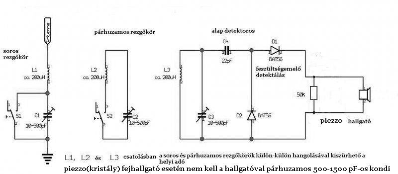 Megépíthető piezzo fejhallgatóval is. A rezgőkörökön lévő kapcsolók a variációs lehetőségeket növelik.