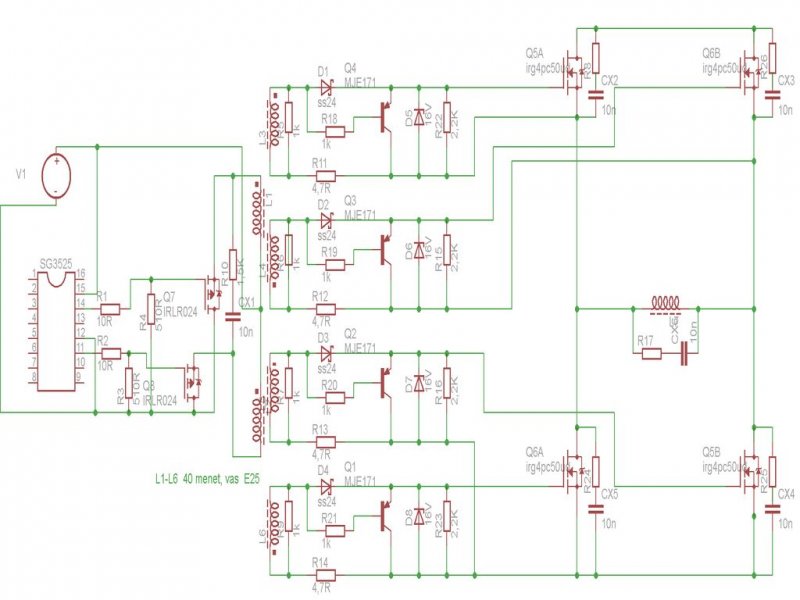 Olvasgattam a fórumot, hátha valaki már esetleg felrakta ide azt a kapcsolási rajzot ami nekem kellene, de nem találtam. Kaptam egy barkács inverteres hegesztőt, ami nem működik. Ondulix 80 fantázianévre hallgat. Szétszedtem, IGBT-k jók, diódák jók, ha 15V külső tápot adok neki akkor megy a vezérlés rendesen. Ha a saját belső tápjáról akarom működtetni akkor nem indul el. Mintha valahol lenne egy kis zárlat. Az UC3845 kb 13,5V-ot kap. Minden félvezetőt végigmértem és jóknak tűntek. Megégve semmi nincs. Ellenállások nincsennek megszakadva. Minden jó ötleltet várok, mi lehet még a baja. Ha valakinek esetleg van rajza hozzá, kérem tegye fel.