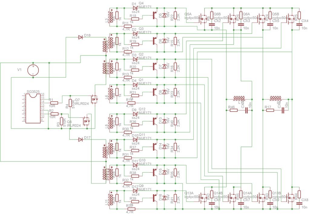 Sajnos az a probléma az összes trafós megoldással, hogy az áramkör kikapcsolási késleltetése a kitöltési tényezőtől függően változik. Ez az áramkör azt használja ki, hogy az MJE tranyók bekapcsolása a trafóban tárolt energia segítségével van meggyorsítva. Ha elég hosszú ideje volt bekapcsolva a primer oldalon a FET, akkor elég nagy mágnesezőáram folyik a trafón, így elég nagy mágneses energia lesz eltárolva a trafóban, tehát, ez besegít az MJE-k bekapcsolásához, tehát azok jó nagy árammal tudnak vezetni, tehát gyorsan kisütik az IGBT-k gate-jében tárolt energiát. Ha viszont kicsi a kitöltési tényező, tehát csak néhány %-ban vezet a FET, akkor kicsi a mágnesezőáram a trafóban, tehát sokkal kisebb lesz az MJE-k árama is. És ezen az sem segít, hogy légrést kerül a trafóba, a hatás továbbra is megmarad. Ráadásul pont az a baj, hogy amikor a leggyorsabbnak kellene lennie az áramkörnek, vagyis zárlatban, vagy zárlat közel, akkor lesz a kikapcsolási késleltetés a legnagyobb. Ez azt fogja jelenteni, hogy az áram a főtrafó kimenetén rendesen túllendül... Egyébként, még így lehet meghajtani a legjobban az IGBT-ket, hiszen a tárolt töltések nem kapcsolódnak párhuzamosan, mert az IGBt-k sincsenek párhuzamosan kötve. Minden IGBT-t egy külön tekercs hajt meg, aminek a szórása ugyanannyi a primerhez képest, vagyis a feszültség emelkedési sebességét csak egy IGBT gate-je korlátozza, nem pedig kettő, vagy három, ha azok direktbe párhuzamosan vannak kötve. Persze, a primer oldalnak bírnia kell a 4 IGBT áramát. Meg arra vigyázz, hogy a vezérlés ne tudjon 100 % kitöltést beállítani, nehogy együtt vezessenek az egymás alatt levő IGBT-k. Legyen közöttük legalább 1 us szünet. Illetve nézd meg, hogy a 3525 kimenetétől az IGBT-k gatejeiig mennyi a késleltetési idő. Annál azért nagyobb legyen, ha ezt a mérést a főkör tápfeszültsége nélkül méred.