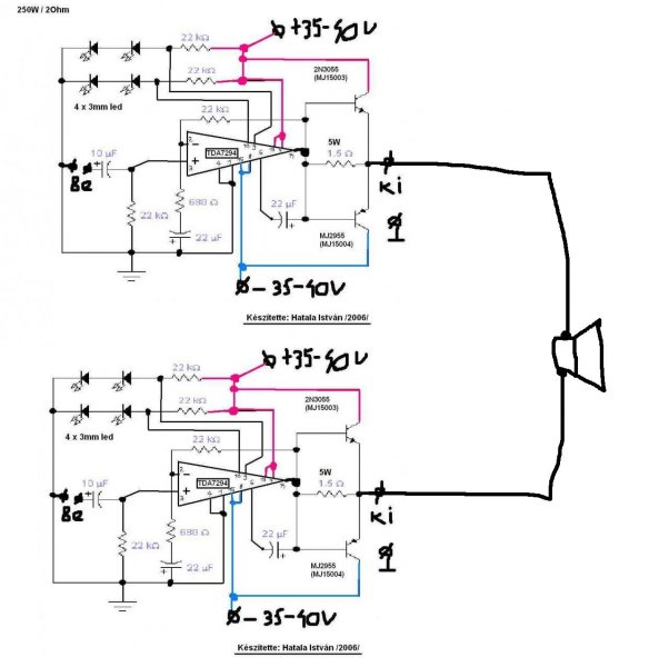 Én még nem próbáltam ezt a kapcsolást és szerintem más sem nagyon volt még eléggé bátor ahoz hogy megvalósítson akár csak valami hasonlót is. Ez csak egy elmélet, hogy akár ilyet is lehet csinálni. A rajz koránt sem teljes, megépítését senkinek sem ajánlom, mert ez ebben a formában nem működne. TDA 7293-ból lehet kettőt-kettőt párhuzamosítani és azokat hidalni az elején egy invertáló fokozattal, ha valakinek ilyen ambíciói lennének. Ez esetben a gyárilag ajánlott kapcsolás lehet a kiindulópont.
