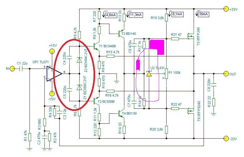A nyugalmi áramról leírtakat azt hiszem értem, viszont ezen a képen még a bekarikázott részem feladatát nem igazán. Én hirtelen csak annyit figyeltem, hogy a műveleti erősítő után, hogyan kapcsolódnak a tranzisztorok, és ezt a két gyakran alkalmazott megoldást vettem észre. Inkább ez a műveleti erősítőre való illesztés érdekel egyelőre.