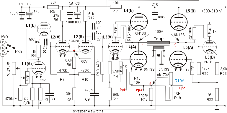 Tényleg érdekes kapcsolás, minden benne van ami csak kapcsolástechnikailag fellelhető: SRPP bemeneti fokozat, majd mindkét fajta fázisfordító... A katodinnnal hajtott végek hídban vannak, végülis így tényleg nem kell szimmetrikusan tekert trafó hozzá...