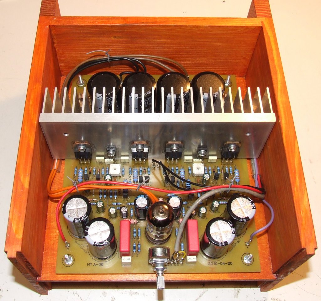 Összeraktam egy "félkész" állapotot a csöves HTA-ból, a próbálgatásokhoz. Ez sem nem asztalosipari műremek, sem nem fémipari kuriózum (ezekre nem is lennék képes). Inkább egy fadoboz, ami a célnak úgy tűnik kifogástalanul megfelel. Úgy alakítottam ki, hogy majd egyszer előlapot is tudjon fogadni, de pillanatnyilag e nélkül is hallgatható.