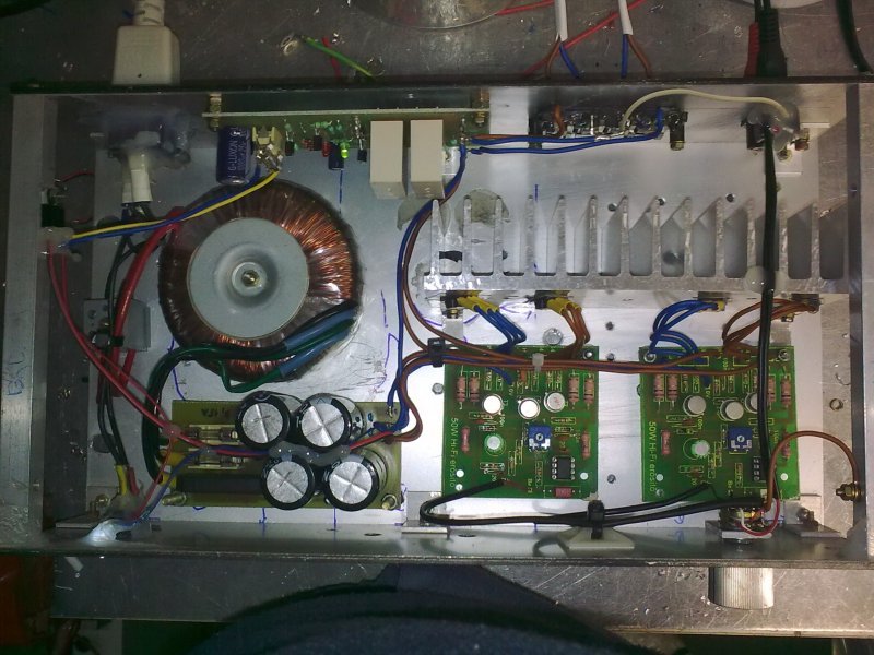 Szerintem nagyfrekis gerjedés. Amit nem hallani, csak fűt, mint az állat, mivel terheli a végfokot. Szigeteld el a bordától az IC-t, és használj csillagpontos földelést, plusz szórd meg 100nano-s kerámiákkal a tápot...