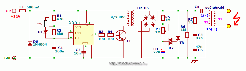 Én is megépítettem. Kihagytam a diódát, BD 249 a tranyó és 26/230 V-os az inverter trafó a nagyfesz előállításához egy régi TV sortranszformátorát és malomkerekét használtam. Kb 1 cm-es a szikraköz.