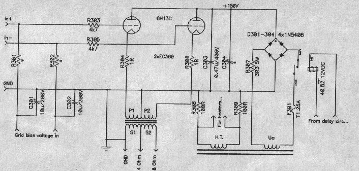 Csatolókondi van a trióda rácsán, (47n) a poti nem "húzza fel" a negatív rácselőfeszültséget. A kapcsolás valamelyik csöves rádió végfokozata. A Szimfónia de Luxeomat alakítottam át így, mert nem tudtam vcs tekercses kimenőt szerezni.