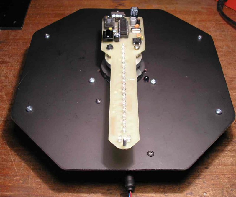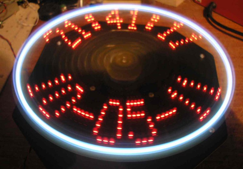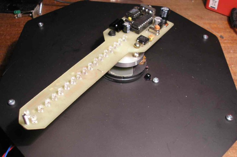 Még néhány képben a készülő propeller clock állapotáról. Most az áramátviteli kisérletekről készitett felvételeket láthatjuk a teszt folyamán, álló és forgó mozgásban is. A légrés kb. 0.5-0.6mm! Készül egy új bázis áramkör és a propeller f628/RTC-s változata. (Az előző propellert nem bontom meg, az marad, mert rendkívül jól dolgozik).