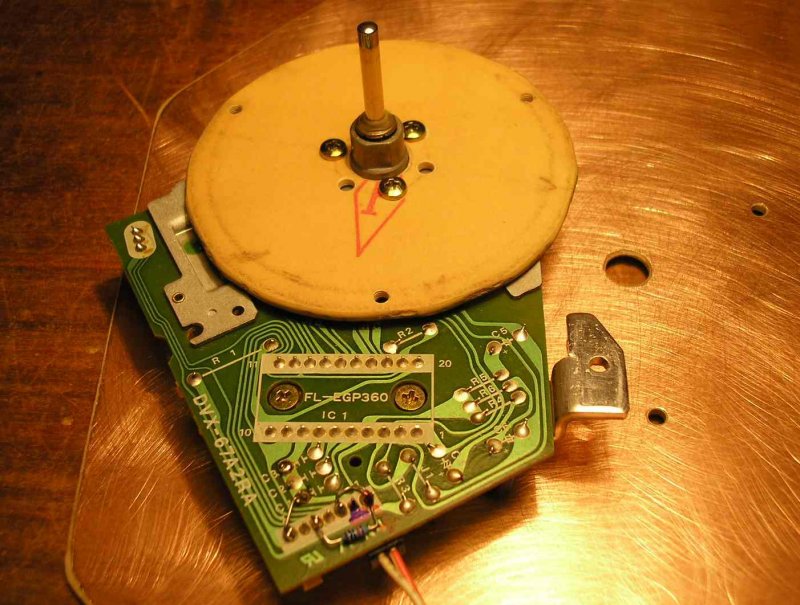 Csak nem hagyott nyugodni a dolog, elkezdtem ezzel a videó-fejmotorból kiszerelt forgótrafóval egy újabb propeller órát építeni. Sikerült találni még egy alkalmas Capstan motort, ez már ugyan nem tud olyan nagy fordulattal dolgozni, de mégis megfelelő lesz. Az áramfelvétele is jóval nagyobb terheléskor, vagyis kb. 320-350mA kell 1200 fordulathoz. Próbálok még javítani ezen is. (A forgótrafó álló tekercs menetszáma 2x2/0.25CuZ, a forgórészen 2x5menet/0.12Cuz van. Kipróbálva, az álló sorosan, a forgó párhuzamosan kötve lett jó). Az összeállítás képein már látható, hogy ez lényegesen alacsonyabb építésű szerkezet lett..