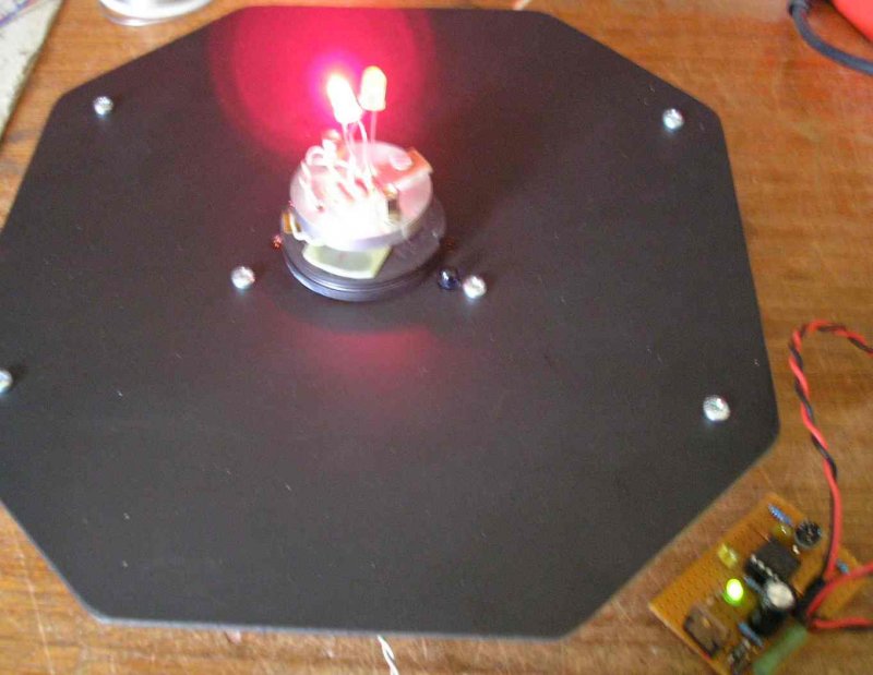 - Nem is tudom valóban kellene-e egy újabb topik ezekhez a DC/ 3 fázisú motorokhoz, egyelőre még hagyjuk ki, aztán majd ránk szólnak a moderátorok. - Annyira stabilan működik a capstan motorral felépített propeller, hogy még egy ilyen kialakítású meghajtót kellene készíteni, ha találok nagy fordulatra is képes motort, meg alkalmas fazékvasat is. Ez utóbbi lehet kisebb méretű is, csak a motortengely átférjen rajta. Az összes áramfelvétel, (1450 fordulaton), 270mA! Egy 12V/300mA-es dugasztápról járatom már harmadik napja. Ilyen kis fogyasztású propellert még eddig nem sikerült készítenem, talán a PC ventillátoros megoldásnál volt hasonló a teljesítmény felvétel. - A motor 140mA-es áramfelvétele az LM2941-el van stabilizálva, a kimenő feszültség ekkor 9.3V. Rohamosan nő az áramfelvétel a fordulatszám növelésével. 12.6V-on már 1800 fordulatnál 395mA lesz, 14.8V-nál már 600mA!, de 2000 fölött pörög a propeller, és a zaj is jelentős lesz. (Ezt csak a méréshez szükséges ideig működtettem, ekkor már veszélyesen melegszik a meghajtó IC!) - Lehet csökkenteni a magas felépítést a következő elgondolásokkal. A motor csapágyház felső szintjét az alaplappal egy síkra hozni, alul megfelelő távtartókkal. Az alsó fazékvas az alaplapra ragasztva, a propeller rögzítő eleme is jóval kisebb, ”karcsúbb” méretekkel elkészítve. Az alaplap alá kerülhetne a bázis áramköre is. Így a magas építmény már nem lenne olyan zavaró, vagy feltűnő.