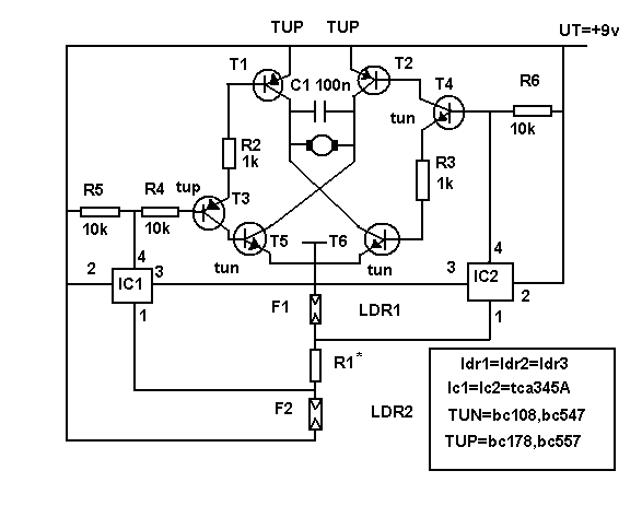 Na itt lesz a fénykövető áramkör, egyszerű és remélem pontosan rajzoltam le. Ha kérdésetek van akkor írjatok..... Nem kell ide bonyolult vezérlésű cucc, az a lényeg, hogy a két fényérzékelő közé egy elválasztó lapot kell tenni és így a cucc addig fordul a mgfelelő irányba, a nagyobb fény felé amíg mind a két érzékelőn azonos érték lesz. Hogy ne mozogjon állandóan minden kis fényváltozásra, arra van a motornál lévő kondi.... /ha nagyon pengék akarunk lenni csinálunk két ilyen cuccot és minden irányba vezérelhető a napelem...... Ha jólemlékszem napelemet és minden más környezetbarát dolgot a permanent.hu -ról lehet beszerezni. Én is innen veszek egy 12 v- os napelemet, ami már sokmindenre használható....