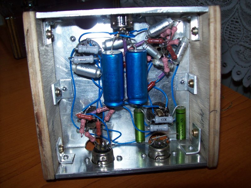 Látom alkalmazod a kb 50 éves technikát! Küldök képet egy 50-es évek táján kiadott rádió SASSZI aljáról.Hasonló a kivitel (a gerjedést pl a hosszú lábak is okozhatják, így célszerű a foglalatra forrasztani az alkatrészt .A fűtést sodorva a két szálat ( az "őrség" kaszás pókok alatti résznél látható) narancs és sárga szín.Sajnos nagyon le van harcolva ,sem háll sem hangtrafó nincs rajt. Szép munka a Tied .Az élben levő furat a hajlítást könnyíti ? Üdv János