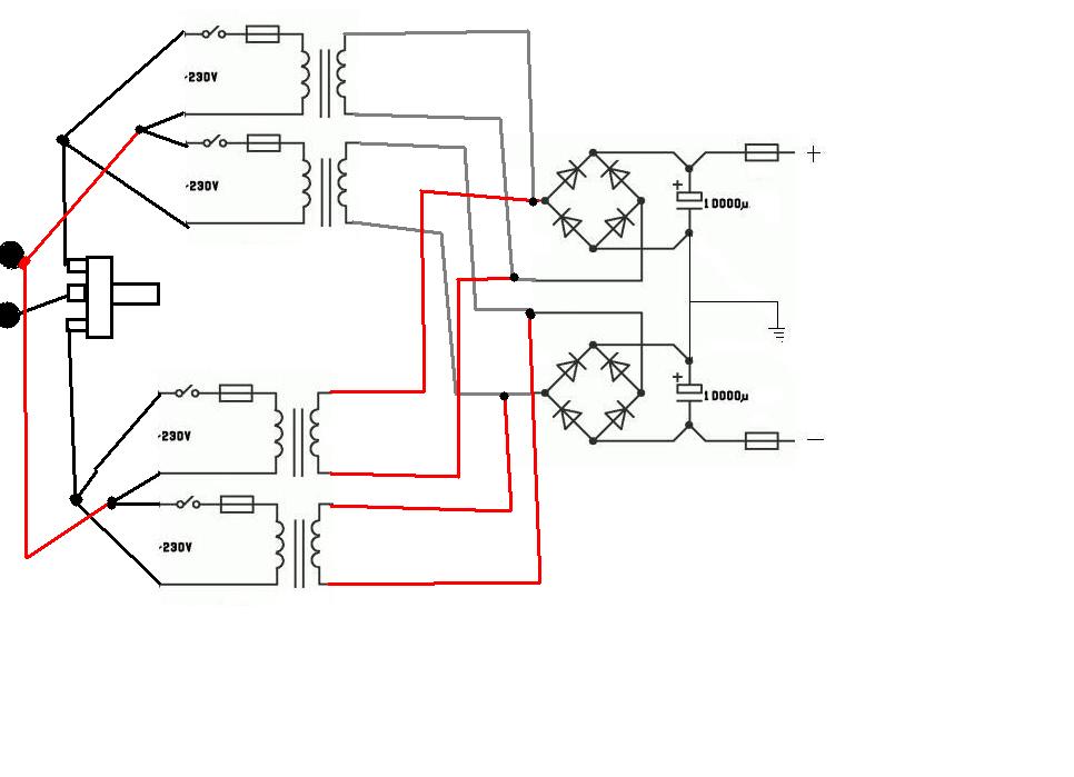 Hello.Jól túlbonyolítottam.Ez így működne olyan képpen hogy más a trafók kimenő feszültsége és így változtassam az erősítő 4 illetve 8 ohm-on való üzemeltetését?Egy 3 állású kapcsolóval lehetne választani hogy melyik trafó(kon) legyen a fesz.Elvileg nem 4 trafó hanem 2 2sec.tekercses trafó lesz.