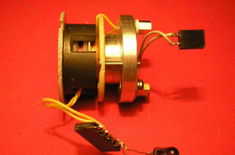 Egy mechanizmust, (Prop_III.), újra összerakok, annyira megtetszett a fazékmagos áramátvitel megoldása. Annyi a különbség, hogy most csak egy ”fél” fazékvassal próbálom megoldani. Ez a fél vasmag 28mm átmérőjű, 11,5mm magas, álló 36menet/0.3 CuZ, a forgó 55menet 0.2 CuZ. Ekkor jóval alacsonyabb lehet a mechanika felépítése. A készülő nyers szerkezetről, és az áramátviteli kísérletről néhány képben.