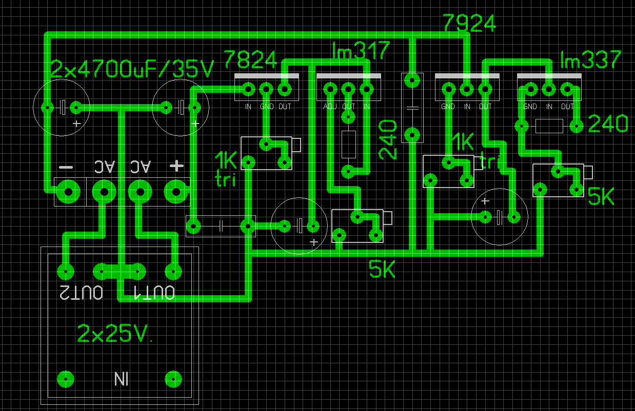 Vegulis mint elkepzeles nem rossz de maganak a kapcsolasnak vannak hibajai. Az elso az elejerol nezve, a kondikat legalabb 50 voltosra kell valasztani, mielott felrobbannanak. A masodik a feszt igy nem tudod 1.2V ala vinni. Harmadik, hogy a LM317, 337-nek kell egy minimum 5 mA terhelo aram kulonben elszall a szabalyzas. Meg egy javaslat: ajanlanam a 7824 helyett a NS doksiban levo LM317 koveto eloszabalyzast (20. oldal). Esetleg erre a tapegysegre jobb lenne a TO3 tokozasu stabler, mert 1,5 A-nel es 1.2 v komenofesznel bizony (~40 W) a TO220 nagyon hataron lessz . (2 C/W vs. 4 C/W). Sok Sikert. Udv Vili