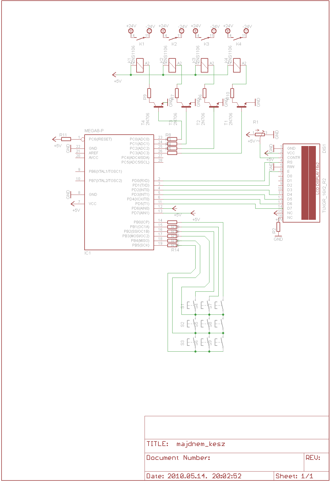 Puli 122 mondta hogy itt tegyem fel a kérdésemet. Terveztem/tervezek egy öntözőrendszer vezérlőt. Szeretném a segítségeteket kérni, hogy van e hiba a kapcsolási rajzban. PB0-PB5 között egy 3*3as key pad található, amin keresztül lehetne majd a vezérlő beállításait elvégezni. MEGA8p a vezérlő típusa melyhez egy LCD csatlakozik. A PD6 és a PD7 lábra ha +5v feszültséget kapcsolunk, akkor az áramkör letiltja az éppen futó folyamatot, azaz vészleállító. PC0-PC3 között a mágnes szelep vezérlő áramkör található. A relén a kimenet +24v és -24v-ként van feltüntetve. Mivel 1 napja használom az eagle-t ezért még nem találtam meg benne a kvarc-ot, ezért az nincs a kapcsolási rajzon. A tranzisztorok típusa más lesz! Köszönöm előre is a segítségeteket