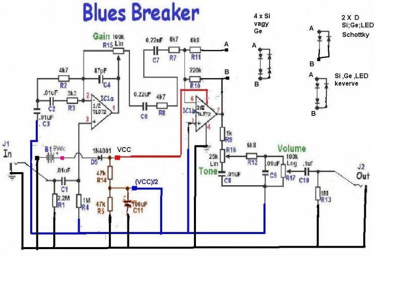 A diodak a masodik IC visszacsatolasaba hatarolnak .Ide lehet tenni ket a ket sorba kotott dioda helyett csak egy egy diodat ,ami lehet LED, Ge dioda ,Silicium,Schottky,.vagy keverve , kiserletezve melyik kombinacio tetszik .Az "A" es a "B" pontokba kell bekotni a diodakombinaciokat.