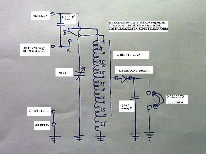 Ez, egy egyszerü detektoros rádió! / A régi idők emlékére !/ Sajnos, nekem nincs huzal antennám,mert egy 3-emeletes házban lakom. Az eresz csatorna víz levezető /amely 12méter magas/ az antenna !!! A földelés:víz csap. Nappal: Kossuth r, Katolikus r, Rádió 4. Este:21.ó-tól: 10-12 adó ! Ennyi az adó vételi "teljesítmény".