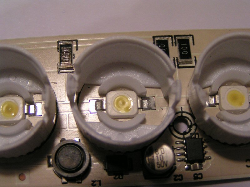 A LED-ek sajnos elhaláloztak, picit látható is, hogy barnák.. Elég sokat világított, megállás nélkül hónapokig. A kérdésem az lenne, hogy milyen LED lehet ez? ki szeretném cserélni, de átalakítás nélkül. Vagyis a LED-ek előtt optika van, annak meg kell maradnia, és az ALU nyák is jó volna, mert mechanikailag így épül fel.