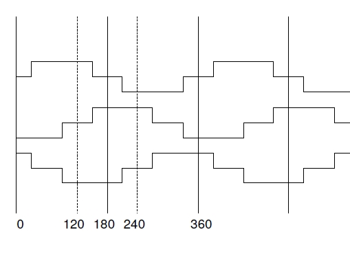Tehát nem pwm jelet kell látnom, hanem a motor fordulatszámának megfelelő frekvenciájú nagyon durva (a középértékhez képest +162V, 0V, -162V értékekből álló) szinuszt? (Trafót nem látok benne, ezért feltételezem, hogy kétutasan/graetz-cel egyenirányított 230VAC-t = 325VDC-t kapcsolgatnak 3 darab fél H híddal)