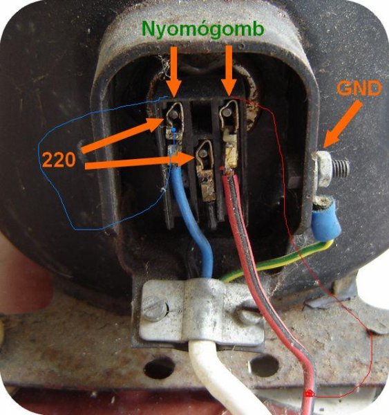 A bekötés még nem teljesen tiszta. Mzolee küldött egy képet. Azon a piros vezeték fekete csíkkal (az lenne a segédfázis?) kifut a látómezőből. Ha az zárja az áramkört egy pillanatra, akkor hol megy vissza?