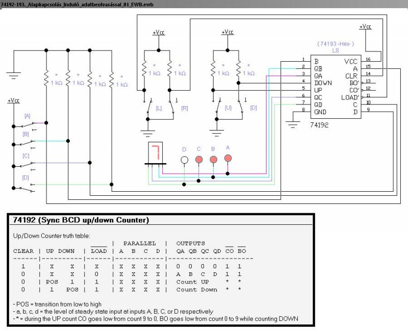Itt van egy alapkapcsolás a 74192-74193-ra. A bemenetei felhúzó ellenállásokon keresztül kap magas szintet s a nyomógomb a GND-re húzza azt. Nem a gomb megnyomáskor, hanem elengedéskor lép a számláló.
