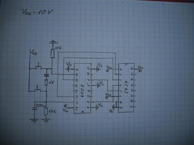 Nos én meg építettem a magam kapcsolását, a sima 7 szegmenses kijelző léptetést. Csak, hogy van egy kis baj. A lefele számlálás az jól működik de a felfelénél nem egyesével lépked, hanem van, hogy kettőt vagy hármat is léptet felfele egy impulzusra. A kapcsoláshoz az előbbiekben említett TTL számláló helyett egy CMOS áramkört választottam a 4029-est. A meghajtó pedig a 4543-as. Így egyszerűbbnek gondoltam. A kapcsolási rajzot csatolom, bár kézzel rajzolt de olvasható (remélem