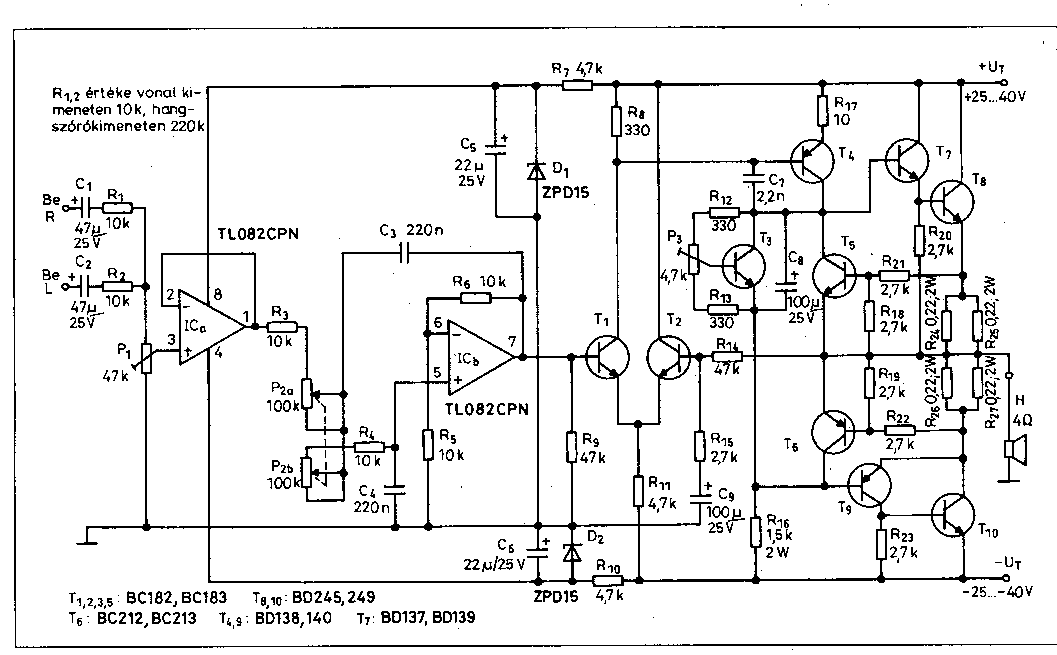 Idézet: „ügye a végtranyókat lehet úgy variálni, hogy az pnp a másik meg npn természetesen a nyákon máshogy bekötve.” Nem tudom ezt hogy gondoltad, de ha ugy, hogy a vegtranzisztorok kozul az egyik NPN a masik pedig PNP akkor ezt nem lehet megcsinalni, nem fogmukodni az erositod! A ket vegtranzisztornak NPN-nek kell lennie es a legnagyobb kivezerelhetoseg erdekeben erdemes betara parba valogatni oket. Ez utobbi feltetel nem annyira fontos, valogatas nelkul is jo lesz az erosito. Az erositobol kiveheto teljesitmenyt nem csak a tapfeszultseg es a terheles nevleges erteke hanem a nyugalmi aram is befolyasolja. Erre vonatkozolag a neten tobb info is van a JLH-rol szolo irasokban. Erdemes azokbol tajekozodni.