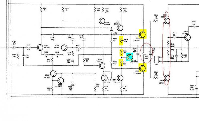A sárgával jelölt "meghajtó" tranzisztorok jók, megmértem őket. A poti és az ellenállások látszólag jók a kékkel jelölt tranzisztort nem mértem, ezeket ellenőrizni fogom. Illetve csatolom a teljes service manual-t, a 19. oldalon található a végfok része.