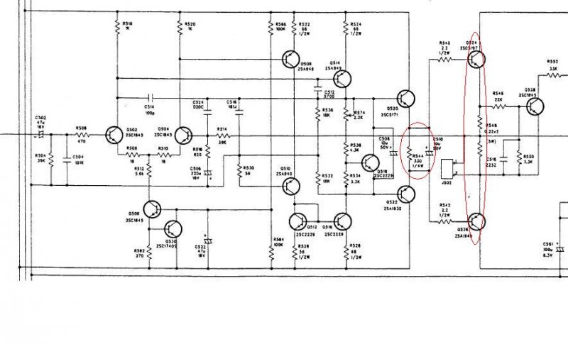 A sárgával jelölt "meghajtó" tranzisztorok jók, megmértem őket. A poti és az ellenállások látszólag jók a kékkel jelölt tranzisztort nem mértem, ezeket ellenőrizni fogom. Illetve csatolom a teljes service manual-t, a 19. oldalon található a végfok része.
