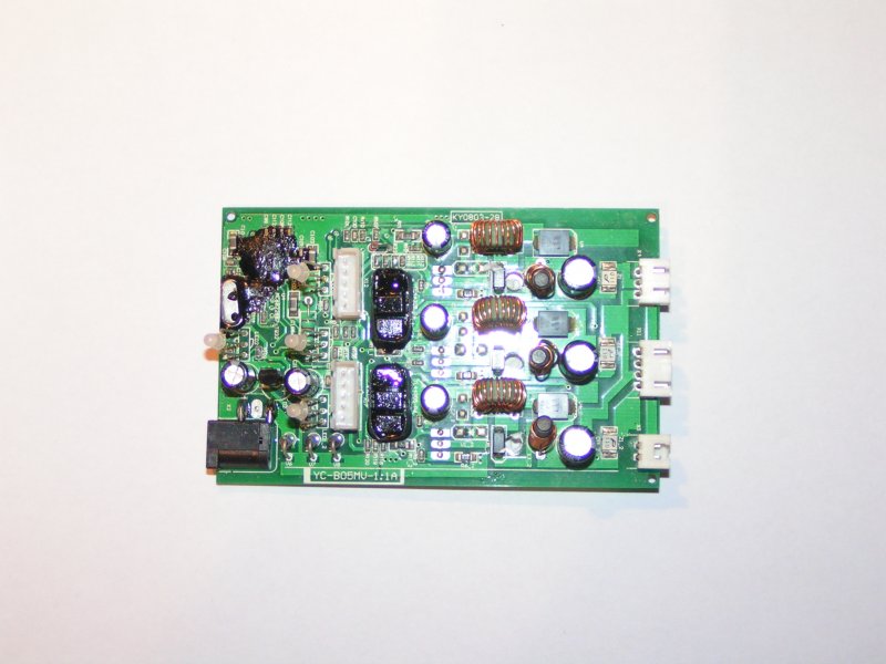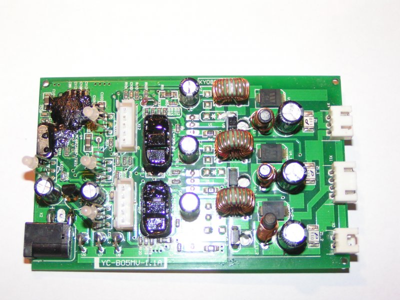 a nyák alsó felén van 3db TO220 tokos felirat nélküli alkatrész is. A bal felső paca alatt IC van, a 2db leragacsozott kocka pedig optocsatoló 3-as..
