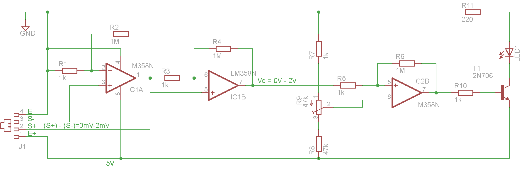 Tehát első körben ezt a jelet kell erősíteni mondjuk 1000 szeresen. Ezt az LM358-as adatlapja szerinti "High Input Z, DC Differential Amplifier" kapcsolás szerint csináltam meg. Az erősítés elvileg 1+1M/1k = 1001 szeres (R2/R1=R4/R3=1000).