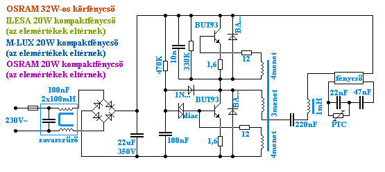 A Idézet: a tekercs induktivitása. „1mH” (Szerintem jobbanjársz ha készen megveszed!) A Idézet: : pozitív hőmérsékleti együtthatójú ellenállás.„PTC” (Pozitív! Tehát ha emelkedik a hőfok, növekszik az ellenállás értéke is.) Ez a Idézet: , annyira egyszerű, hogy szinte elsemlehet rontani! „IMG_0001.jpg” Minden alkatrész a megfelelő helyre került, lábaik OK? Milyen fénycsövet használsz?
