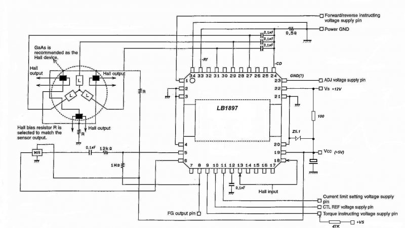A végére mégiscsak összejön, de nagyon sok kivezetése az IC-nek másként van jelölve mint általában. Először 5V körüli táppal nézd meg, a Vs-t ez esetben is össze lehet kötni a Vcc-vel egy kb. 100 Ohm-on, és nem árt egy Z5.1 sem a Vcc lábától a GND-ig bekötve. A tápfeszt természetesen a Vs-re kapcsold ezután.