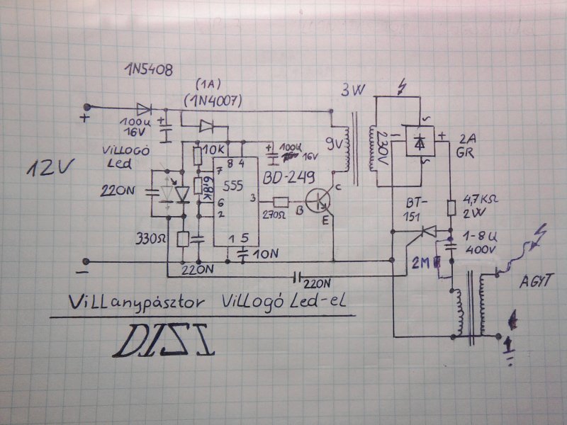 Szia. Nem a te készülékedbe van a hiba. Én is nem rég építettem meg. A kapcsolás működik de melegszik. A gyújtótrafó kb. 2.5 ampert vesz fel ami a tranyón folyik át. A baj hogy sokáig van nyitva a tranyó. Gyakorlatilag az egész áramkör lelke egy astabil multivibrátor ez vezérli a tranyót. Az lenne a megoldás szerintem ha az ic nem ugyan annyi ideig tartaná nyitva a tranyót mint amennyi ideig zárva. Akkor lenne jó ha egy rövid ideig nyitná és hosszú ideig zárná a tranyót. A gyújtótrafó akkor inukálja a feszültséget ha a primerben megszünik a feszültség és összeomlik benne a mágneses tér tehát a tranzisztornak elég lenne egy nagyon rövid ideig nyitva lenni. Szerintem így nem melegedne fel. Azt még nem tudom milyen módosítással lehetne megoldani de ha valakinek van ötlete esetleg megoszthatná velünk.