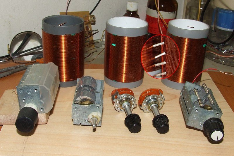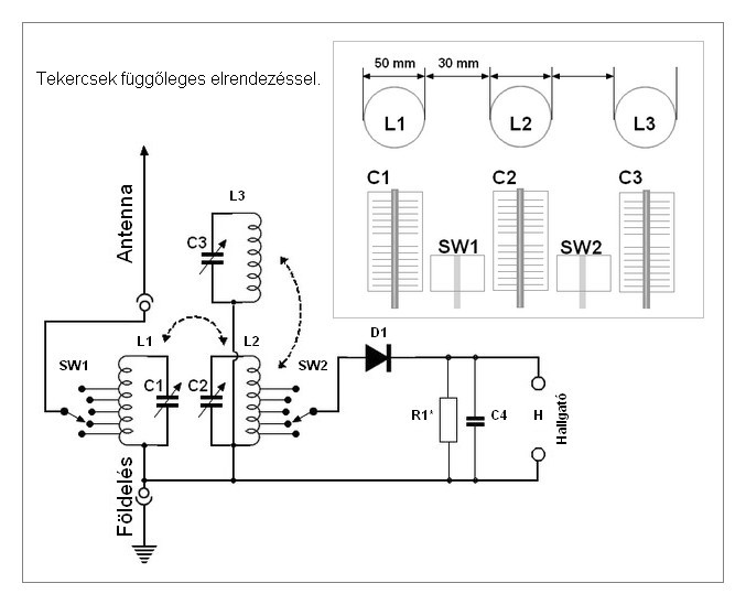 A mellékelt képek szerint készítettem el egy etektorost. A készüléket kipróbáltam. A mellékletek, most a végső összeszerelés előtti állapotot mutatják. A tekercsek iduktív csatolásban vannak egymással. A három tekercs egyforma minőségben ill. méretben készült el. A hullámcspda (L3) tekercse is fontos hogy jó minőségű legyen. Elsősorban az alkatrész, főleg a tekercsek elrendezésében szeretnék tippet adni.